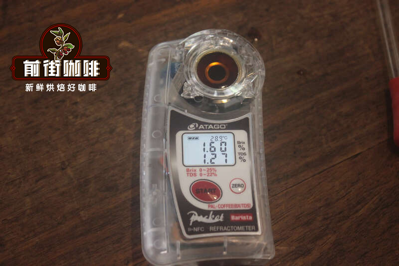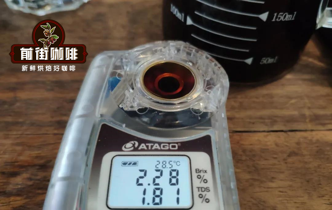1.2-1.45%只是个统计范围,适用于大部分人的口感,如果低于或高于该范围,只要符合自己口味要求也可以。不过像下图,前街咖啡以1:10的粉水比例冲煮花蝴蝶咖啡,TDS测试仪测出的结果超过范围太多了,几乎是一倍以上,口感上会明显感觉到过萃了。